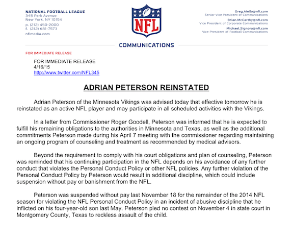 NFL Reinstates Adrian Peterson After Domestic Abuse Suspension