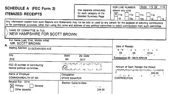 But that doesn’t mean things don’t get awkward sometimes. Via WMUR’s James Pindell, a campaign finance report shows Brown donating to his own campaign — and listing his employment as state senator for “the Commonwealth of Massachusetts.”