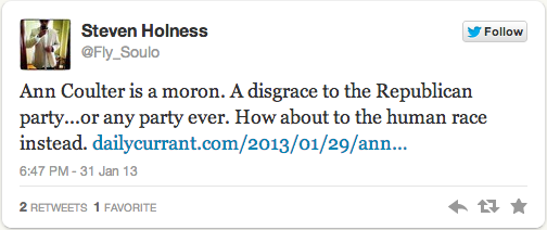 Meanwhile, the real Ann Coulter herself has her own criticism of the Currant’s article and resulting outburst: “These ‘satire’ sites would work better if their writers had the tiniest ability to be funny.”