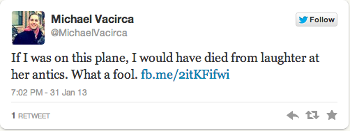 No, actually. If you were on that plane, you would have been a character in a parodical article about Ann Coulter and thus you wouldn’t actually exist, your tweet would never exist, and your actions would be subject to the whims of the article’s author. So chew on THAT hypothetical.