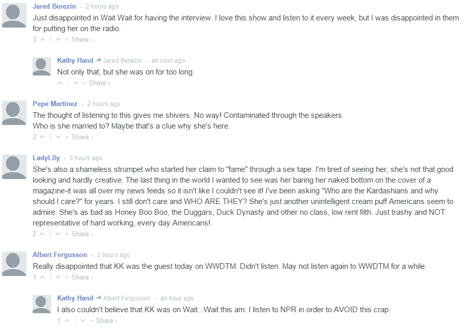 Compared to most WWDTM “Not My Job” rounds, Kardashian’s isn’t all that great. Yet Pesca, judge and scorekeeper Bill Kurtis, and panelists Maz Jobrani, Amy Dickinson and Peter Grosz manage to get a few good laughs out of the episode. However, the comments section on NPR’s website — usually a bastion of loving support when compared to the rest of the Internet — turned fairly quickly.