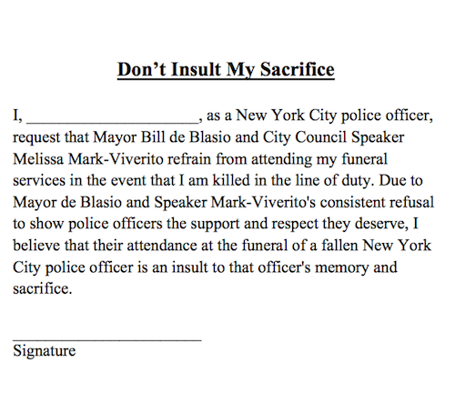 The New York City Patrolmen’s Benevolent Association (PBA), one of the city’s main police unions, is urging its members to sign a letter requesting that Mayor Bill de Blasio and City Council Speaker Melissa Mark-Viverito do not attend their funeral services should they be killed in the line of duty.