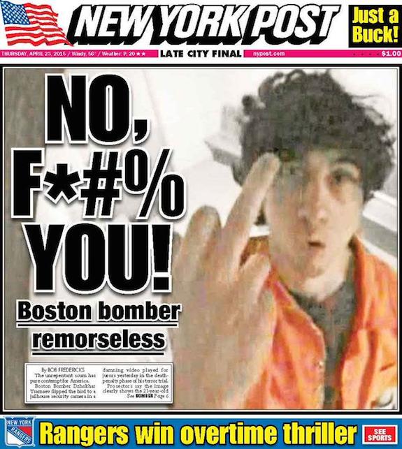 NY Post Takes on ‘Unrepentant Scum’ Tsarnaev With Middle Finger Photo Cover