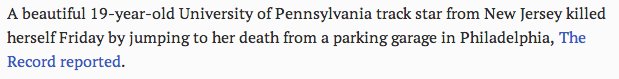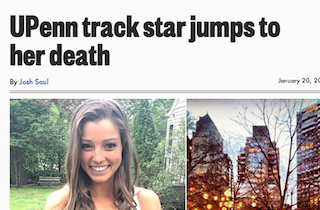 Madison Holleran, a 19-year-old UPenn track star, jumped to her death from a parking garage Friday night in what authorities are calling a suicide. Shortly before the incident Holleran posted a photo to her Instagram account of the nearby Rittenhouse Square, with no caption.