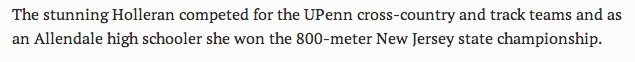 The accompanying article is similarly concerned first and foremost with Holleran’s looks, opening with a description of her as “a beautiful 19-year-old University of Pennsylvania track star from New Jersey” and going on to call her “the stunning Holleran”: