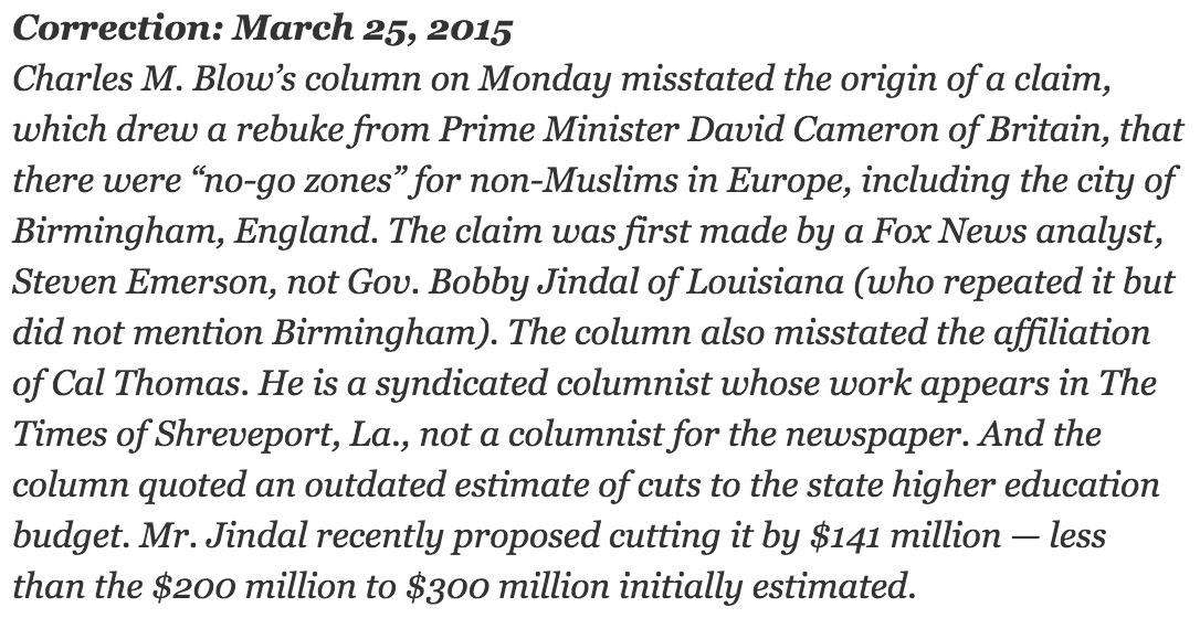 Two days after Charles Blow wrote a takedown of Gov. Bobby Jindal (R-LA) in the New York Times, the newspaper issued not one, not two but three corrections to the piece.
