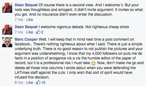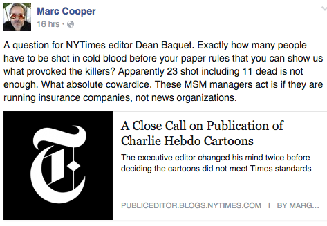 Yesterda, New York Times executive editor Dean Baquet explained they made the call not to show the Charlie Hebdo cartoons because he considers them a “gratuitous insult.” In response, University of Southern California journalism professor Marc Cooper posted this on Facebook: