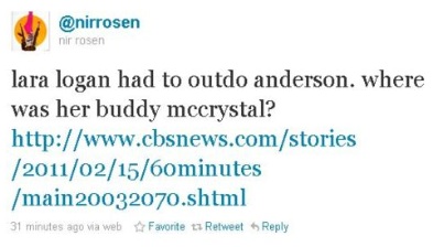 Tragic news broke yesterday that CBS News’ Lara Logan was victim to a sustained a brutal sexual attack at the hands of a dangerous element amidst the celebration in Cairo’s Tahrir Square. The news brought universal condemnation and empathy from Logan’s media peers, but it also seemed to also bring the worst out in some people as well. Take for example now former NYU Fellow Nir Rosen , who took to his Twitter feed to make what he later claimed to be inappropriate jokes that he soon deleted. In the firestorm of controversy that followed, Rosen offered his resignation, which NYU readily accepted.