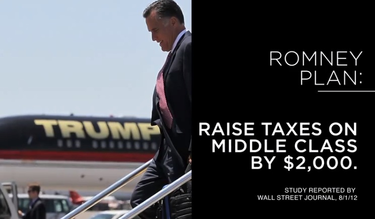 “But Romney offered no tangible ideas to move the country forward – not a word about his plans for the future,” the narration continues. “He didn’t talk about his plan to give trillions in tax cuts to big corporations and the wealthy paid for by the middle class; or his plan to end Medicare as we know it by guaranteed benefits with a voucher system. He didn’t talk about his budget, which could cut funding for K-12 education and Pell Grants for college by 20 percent; or his plan to slash funding for renewable energy like wind, but keep billions in taxpayer subsidies for oil giants.”