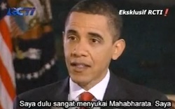 It may concern some viewers to hear Obama speak of his love for (what sounds like) Mohamed Atta‘s stories when he was a child. (Atta was an influential ringleader behind the 9/11 attacks and was the hijacker who flew Flight 11 into the first tower.) Do not be alarmed: Obama is talking about Mahabharata, which along with the R?m?ya?a make up the Sanskrit epics of ancient Indonesia, from which the foundation of Hinduism sprung. So depending (once again) on your political stance this video will either be viewed as confirmation that our president is a well-traveled multi-lingual diplomat, or a great evil come from another country to destroy ours.