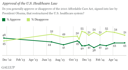 The result? The Affordable Care Act’s approval rating is the same now as it was one year ago. In June of 2013, the law was underwater by eight points; today the law is underwater by eight points, 43-51.