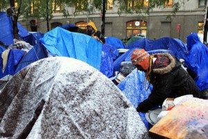 One protestor told Reuters that one-fifth of the protestors probably left when the snow began to fall, but “[t]hey’ll be back, we’re not going anywhere.” There have been reports of hypothermia, and yesterday various bloggers were speculating over whether the coming winter season would dilute the masses of the Occupy Wall Street protests or if it would be irrelevant. It is clear at this point that the protestors have no indication to stop their efforts, and they are trying to survive on the reliance of others giving what they can to the movement.