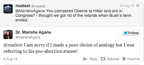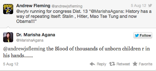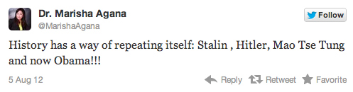 “History has a way of repeating itself: Stalin, Hitler, Mao Tse Tung and now Obama!!!” wrote Dr. Marisha Agana, the Republican candidate for Ohio’s 13th congressional district seat, via Twitter: