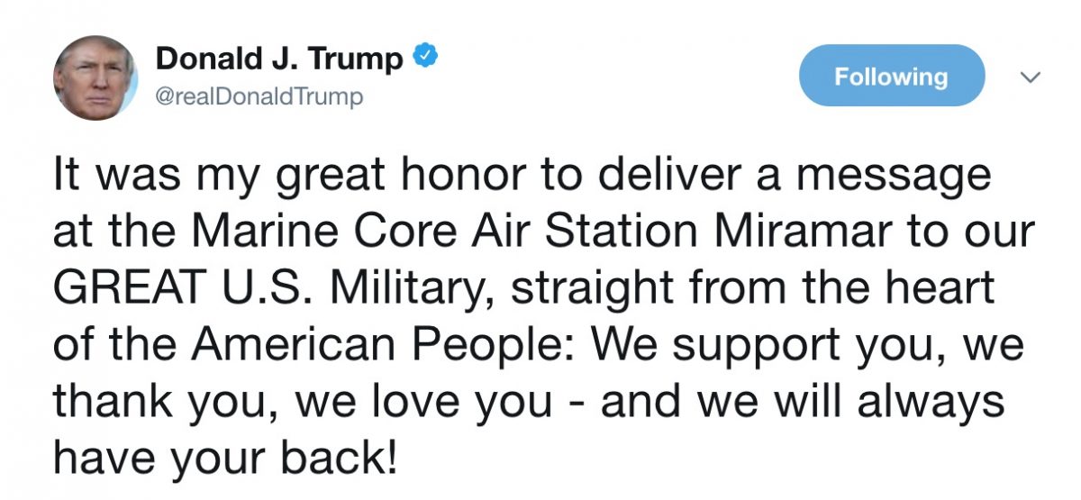 It was my great honor to deliver a message at the Marine Core Air Station Miramar to our GREAT U.S. Military, straight from the heart of the American People: We support you, we thank you, we love you – and we will always have your back! pic.twitter.com/NEGCR6rM7Y