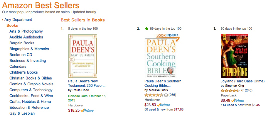 Pre-orders for Deen’s new cookbook Paula Deen’s New Testament — due out in October — climbed to the top of the Amazon.com “Best Sellers” list. In second place is her Southern Cooking Bible. Among the top 20 best-sellers, Deen also has The Deen Family Cookbook in 19th place.