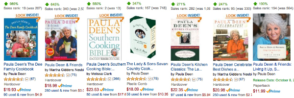 Deen’s book empire now also has a serious presence among Amazon’s list of “Movers and Shakers,” which notes the top 20 highest percent increase in sales for particular books in the last 24 hours: The Deen Family Cookbook sales are up 989%; Paula Deen & Friends is up 645%; Southern Cooking Bible up 550%; The Lady & Sons Savannah Country Cookbook sales are up 347%; Kitchen Classics up 271%; Paula Deen Celebrates! up 247%; and Living It Up, Southern Style up 190%.
