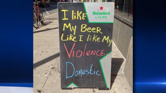 A Philadelphia bar has come under fire for putting a sign outside inviting people in with a joke about domestic violence. On a sign outside BarLy, someone wrote, “I like my beer like I like my violence. Domestic.”