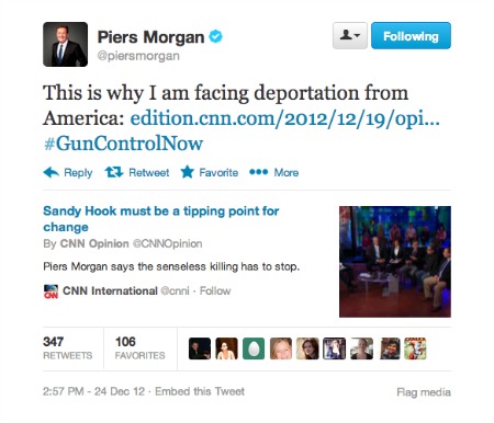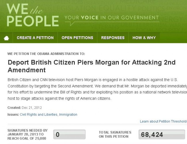 The petition to deport CNN host Piers Morgan for his recent comments on gun control has reached over 68,000 signatures as of this posting, which will force the White House to respond. The petition, created Friday, needed 25,000 signatures within 30 days for the White House to take action and it’s reached far more than that in a mere three days.