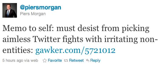 By this morning, Morgan seemed to have learned his lesson thanks to the slightly unflattering Gawker headline “CNN’s Piers Morgan Will Fight Almost Anyone on Twitter”. Linking to that post, the host had this to say: