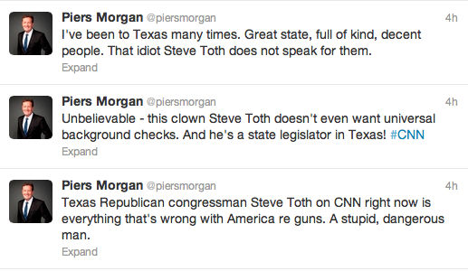 “Texas Republican congressman Steve Toth on CNN right now is everything that’s wrong with America re guns. A stupid, dangerous man,” Morgan tweeted.