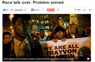 White people, am I right? The reactions to President Obama‘s recent remarks on the killing of Trayvon Martin, and its reflection of the black experience, have run a rather predictable gamut, but Politico’s Roger Simon penned a column that epitomizes a muted perspective in this conversation: the seemingly well-intentioned, yet detached, white middle. The premise of his “Race talk over. Problem solved” column is that Americans should talk more about race, but then he demonstrates why maybe some of us shouldn’t.