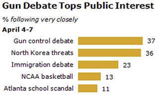 However, the Pew Research Center For The People And The Press actually does measure how much people care about various issues in the news, and their most recent survey indicates that Americans care more about the gun debate than any other issue, and have for most of this year. In the January 3-6 survey, 34% of Americans said they were following news on the gun debate very closely, a close second to the fiscal cliff’s 38%. Since then, the gun debate has dominated the survey every time it’s been included: