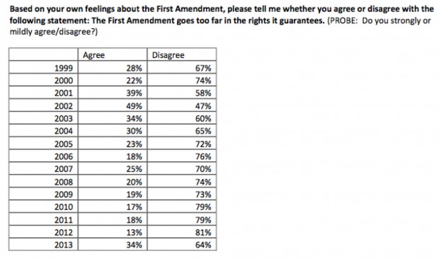 This is, however, more support for the First Amendment than was measured in either 2001 or 2002, when 49 percent of respondents agreed that the First Amendment “goes too far.”