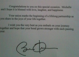 Congratulations to you on this special occasion. Michelle and I hope it is blessed with love, laughter and happiness.
