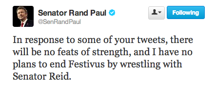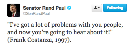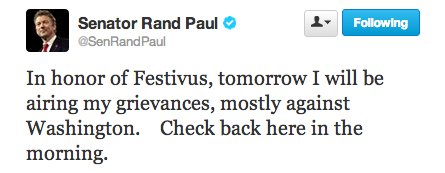 In honor of Festivus*, the venerated Frank Costanza-inspired holiday tradition, Senator Rand Paul (R-KY) took to the Twitterz to air his grievances, most of them against Washington, D.C. I know what you’re thinking: isn’t airing anti-D.C. grievances against kinda Paul’s year-round thing? Grinch.