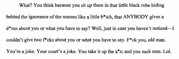 “Just for the record: you are a hoe,” she wrote. “This court is a hoe. And I will backhand you both, should you continue to waste my time.”