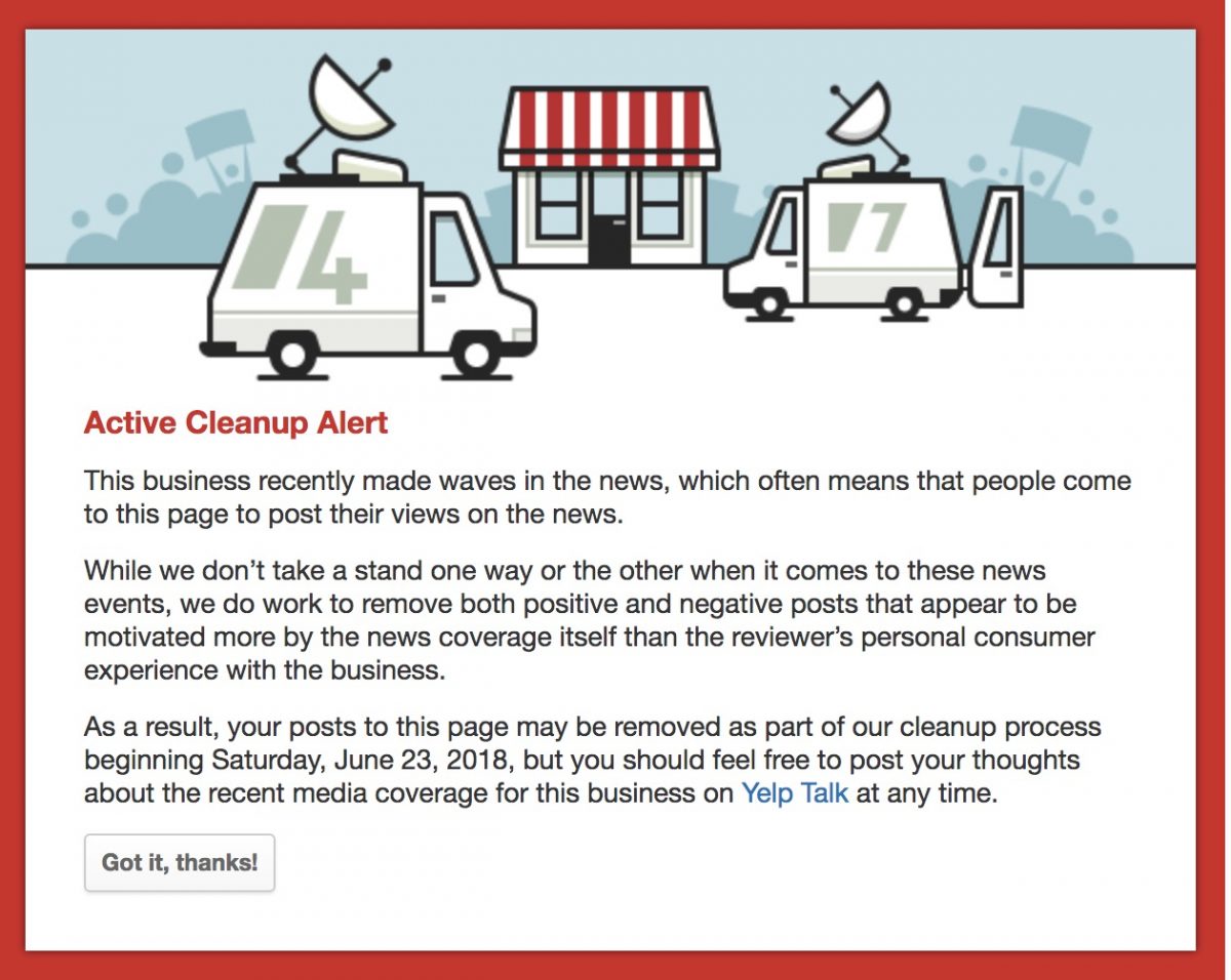 Don’t expect the reviews to last for long, however, Yelp is already in active clean-up mode.