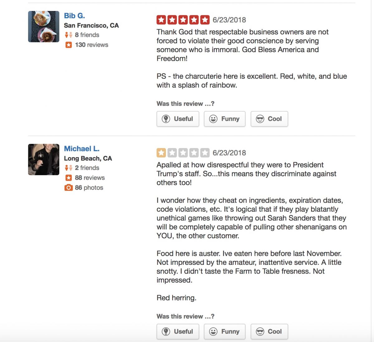 On Yelp, the reviews were all politics, with both one and five star reviews reflecting not the food, but the controversy of the day.