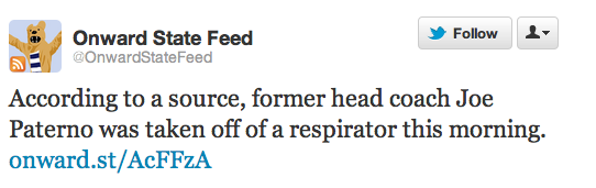Onward State reported that Paterno was taken off his respirator early Saturday morning.