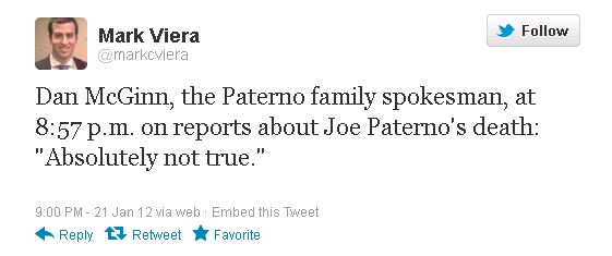 UPDATE 2:Fox News confirms that Joe Paterno has died. The cable news network was the first to report the former Penn State football coach’s passing.