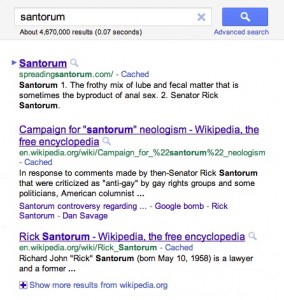 The vulgar search results began showing up several years ago after sex columnist Dan Savage started a “Google bombing campaign” against the former Senator after he had made anti-gay remarks to a reporter.