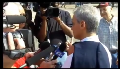Eventually local CBS affiliate reporter Jay Levine butts in front of him to cut off his access to Emanuel, but that doesn’t stop Kelly from continuing with his questions while Emanuel attempts to give a statement. This proves too much for Levine, who turns around and shouts “Let him finish or I’m going to deck you!” So more defending his ability to get some uninterrupted copy than Rahm himself, but near fisticuffs nonetheless. Sweet home Chicago! Rahm meanwhile, no doubt aware this is going to pop up on YouTube before the day is out, beats a quick and quiet exit. Video below.