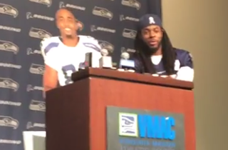 Earlier this week, Seattle Seahawks player Marshawn Lynch got fined $100,000 by the NFL for not talking to enough reporters after a game, violating the league’s media policies. His teammate, outspoken cornerback Richard Sherman, decided to point out the league’s hypocrisy by staging a press conference with teammate Doug Baldwin, as played by a life-sized cardboard cutout of Doug Baldwin.