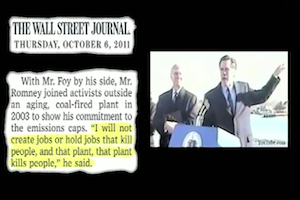 The centerpiece of the ad is audio of Romney saying in his commitment to fighting dirty coal plants, “I will not create jobs or hold jobs that kill people, and that plant, that plant kills people.” The ad then asks “Sound Familiar?” and features Obama’s much-maligned quote saying “under my plan of a cap and trade system, electricity rates would necessarily skyrocket.”