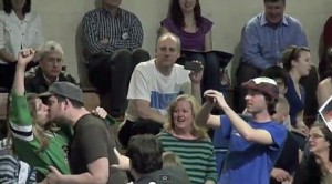 Rick Santorum supporters were enraged as two male hecklers interrupted the Republican hopeful’s rally at Christian Liberty Academy in Arlington Heights, Illinois by kissing each other. The incensed crowd erupted in boos, as security guards quickly surrounded the instigators and ushered them out of the assembly before it got ugly. The aggravated attendees were thrown into a frenzy and began screaming “U-S-A! U-S-A!” in the protesters’ faces.