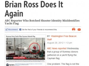 The conservative Washington Free Beacon thinks they have ABC News’ Brian Ross nailed for contributing to a report which says that the Romney Victory Council’s party yacht is flying a Cayman Islands flag, an uncomfortable symbol of Mitt Romney’s secretive finances. According to the Free Beacon, the yacht is actually flying the flag of Bermuda, but it appears their research may have been a tad lazy.