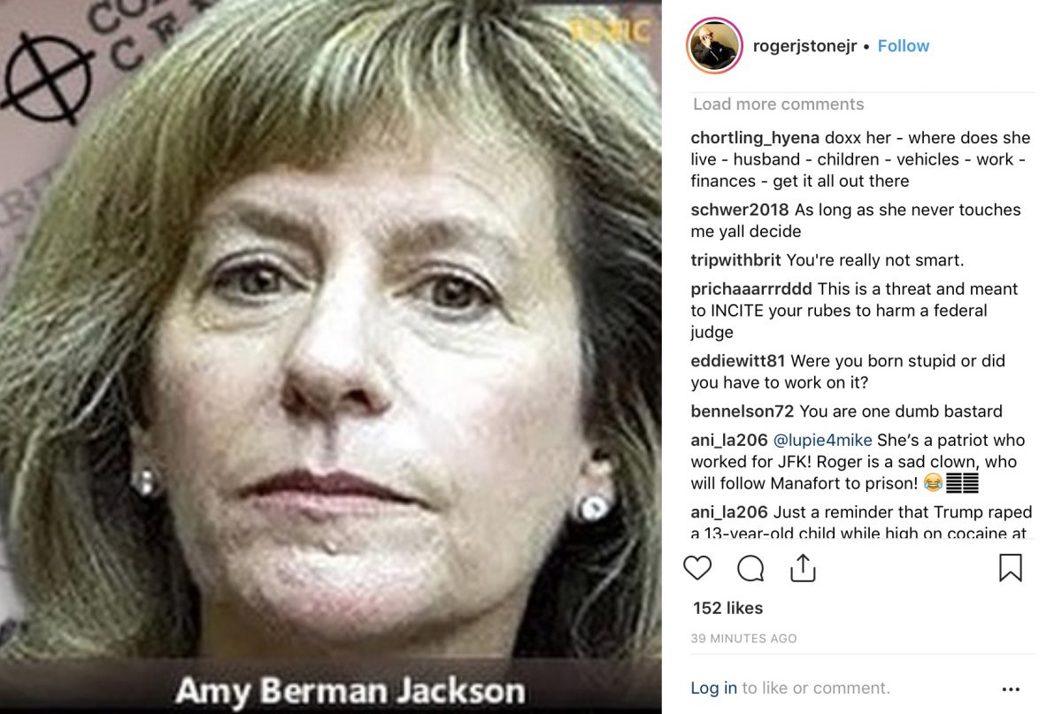 Roger Stone‘s Instagram account today posted a picture of the judge overseeing his case, Judge Amy Berman Jackson.