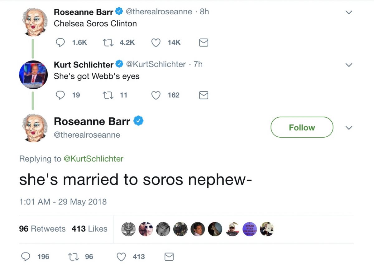 Barr’s frantic Twitter marathon kicked off with two tweets — which have since been deleted — claiming Chelsea Clinton was married to George Soros‘s nephew, a (false) rumor that was initially spread by Scott Baio, of all people: