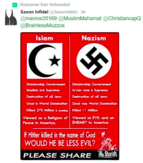 At one point, Barr retweeted a meme comparing Islam to Nazism which claims part of the religion’s mission is “world domination” and “destruction of all Jews.”