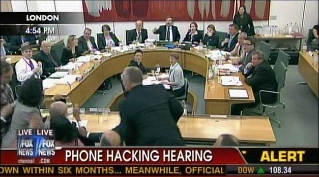 Details are now emerging. CNN’s is reporting that someone from the public wearing canvas trousers and a checked shirt, walked to the front to the back and pulled out some shaving foam which he put on the face of Rupert Murdoch. Wendi Deng, Murdoch’s wife, immediately jumped up and struck the individual. The individual who struck Murdoch is said to have exclaimed “you are a greedy billionaire.”