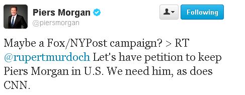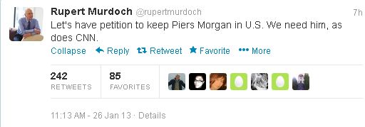 Many of those who would like to see Morgan shipped out may also watch Fox News, the network owned by one Rupert Murdoch. That same Murdoch has also been advocating for some gun control laws in the wake of the Newtown massacre and today took to Twitter to defend Morgan. . . sort of.