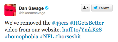 While the video still remains on the 49ers’ YouTube channel, Dan Savage announced on Twitter that he was removing it from the “It Gets Better” website.