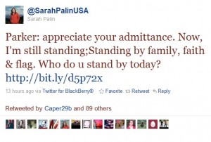 On the heels of Kathleen Parker‘s admission/boast that she “led the (media) assassination” of Sarah Palin during the 2008 campaign, the former Alaska governor struck back at Parker, putting another grizzly-sized footprint on the English language in the process. Via her Twitter feed, Palin said “Parker: appreciate your admittance. Now, I’m still standing; Standing by family, faith & flag. Who do u stand by today?”