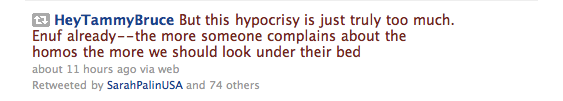 Conservative radio host and proud lesbian Tammy Bruce joined the discussion about Navy Capt. Owen Honors and his controversially homophobic videos shown to his Navy crew, by tweeting, “But this hypocrisy is just truly too much. Enuf already–the more someone complains about the homos the more we should look under their bed.” Sarah Palin, who has not spoken out on the issue of “don’t ask don’t tell” or any gay issue really, re-tweeted Bruce’s message, thus leaving us to speculate about the meaning of this retweet heard ’round the world.