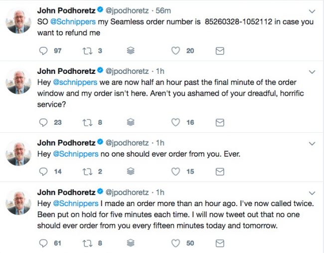 Podhoretz had a minor fit on Twitter after his order from Schnippers — a New York burger chain — was very, very late.