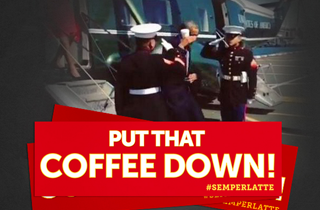 Lo and behold: Barack Obama saluted the Marines while holding a latte! Ka-ching.